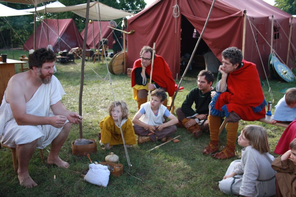 Schlüpfen Sie dank authentischer Bekleidung und der nötigen Ausrüstung für ein Lagerleben in die Rolle einer römischen Soldatenfamilie und entdecken Sie das Abenteuer Geschichte! Schlafen im Römerzelt, Kochen am Lagerfeuer, Patrouillengänge im Kastell, historisches Handwerk und viele weitere Ideen, die individuell nach Gruppenzusammensetzung für Ihr Lager geplant werden.