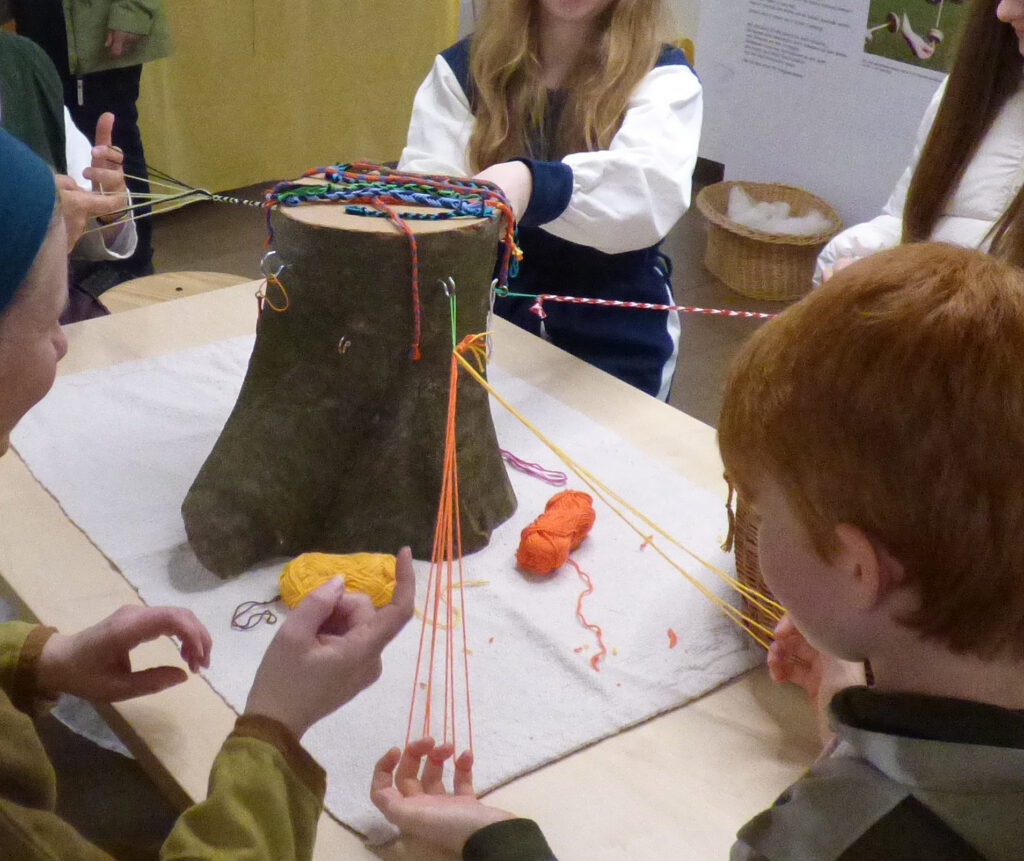 Wir arbeiten in Gruppen am Webstuhl: Nach dem Zetteln der Kette, und dem Übertragen in den Gewichtswebstuhl, folgt das Einrichten des Webstuhls, mit dem Anhängen der Gewichte, dem Litzeneinzug für eine Köperbindung. Ist das alles geschafft, geht’s ans Weben der Varianten der Köper-Grundbindung